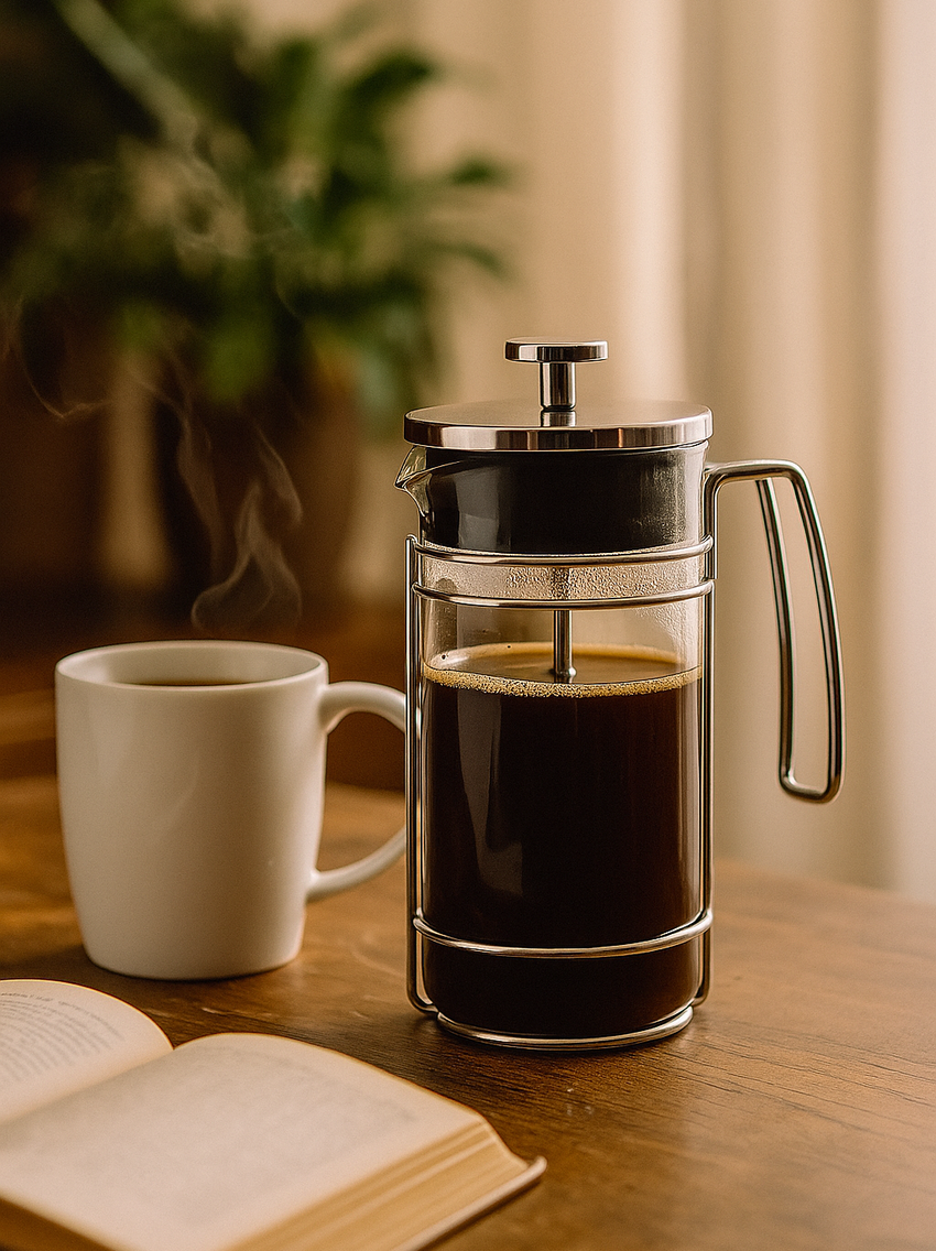 A cafeteira francesa é prática e cheia de charme: não precisa de filtro de papel, pois o êmbolo da prensa faz a separação entre o pó e a água. Assim, os óleos naturais do café são preservados e transferidos para a bebida, resultando em uma xícara muito mais aromática, encorpada e saborosa.